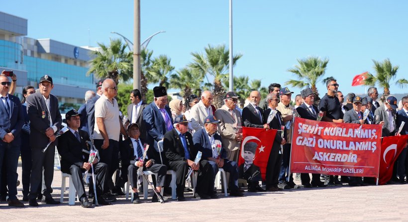 Aliağa Kaymakamlığı tarafından Cumhuriyet Meydanı’nda gerçekleştirilen törene Aliağa Kaymakamı Zekeriya Güney, Aliağa Belediye Başkanı Serkan Acar, Garnizon Komutanı Albay Faruk Altun, Aliağa Cumhuriyet Başsavcısı Mehmet İmir, şehit yakınları, gazi ve gazi yakınları, askeri erkan, kurum müdürleri, belediye meclis üyeleri, siyasi parti yöneticileri, sivil toplum temsilcileri, öğretmenler, öğrenciler ve vatandaşlar katıldı.