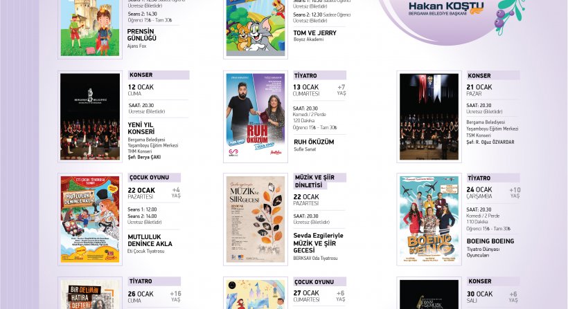 6 Ocak’ta çocuk tiyatrosu ile başlayacak etkinliklerde, Ajans Fox’un sahneleyeceği “Prensin Günlüğü” oyunu 2 seans sahne alacak. 11 Ocak’ta Boyoz Akademi’nin “Tom ve Jerry” oyunu sadece öğrencilere özel ücretsiz olarak Bergama Kültür Merkezi’nde gösterime girecek.