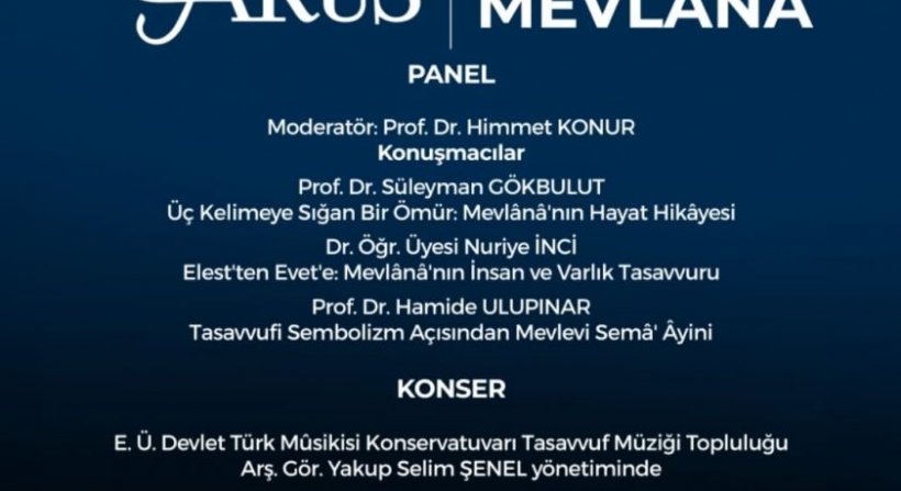 Ege Üniversitesi Birgivi İlahiyat Fakültesi tarafından Mevlânâ Celâleddîn-i Rûmî’nin 751’inci vuslat yıl dönümü dolayısıyla “Şeb-i Arus Vuslatın 751. Yılında Mevlânâ” başlıklı panel gerçekleştirilecek.