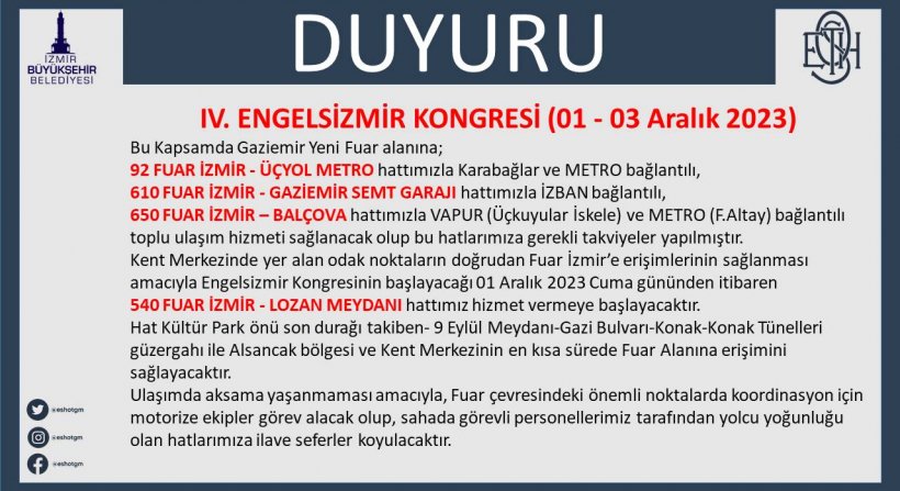 Engelsiz yaşam yolunda sayısız proje yürüten İzmir Büyükşehir Belediyesi, 1-3 Aralık tarihlerinde ev sahipliği yapacağı 4. Engelsizmir Kongresi için ulaşım noktaları oluşturdu. Karşıyaka İskele, Fahrettin Altay Metro Durağı, Konak Diş Hastanesi Önü, ESBAŞ İZBAN İstasyonu önünden kaldırılacak servisler ile engelsiz ulaşım araçları Gaziemir Fuar İzmir’e ring seferleri düzenleyecek. Araçların kalkış saatleri 09.00, 10.00, 13.30, dönüş saatleri ise 14.30 ile 17.30 olarak belirlendi.