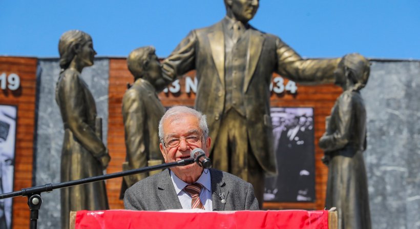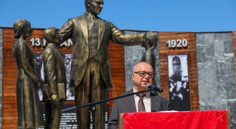Aliağa Belediye Başkanı Serkan Acar ise yaptığı konuşmasında şunları söyledi: “Cumhuriyetimizin kurucusu Ulu Önder Gazi Mustafa Kemal Atatürk 13 Nisan 1934 yılında Aliağamızı ziyarette bulundu. Gazi Mustafa Kemal Atatürk bulunduğumuz bu noktada, o günkü ismiyle Aliağa Mektebi’nde öğretmen ve öğrencileriyle buluştu. ADD Yönetimimiz ile birlikte bunu anıtlaştırarak gelecek nesillere bırakmak istedik. Aydın Adnan Menderes Üniversitesi’nin değerli heykeltıraşı Mustafa Tuncay hocamızı Aliağa’ya davet ettik. Yaptığı çalışmalar sonucunda bu anıtı yapma kararı aldık. Anıtta o günü temsilen öğrenciler bulunuyor. Bu öğrenciler, Aliağamıza çok değerli eğitim hizmeti vermiş olan Muzaffer Örnek, bir diğeri ise Feride Özsoy’dur. Kendilerine Allah’tan rahmet diliyorum.