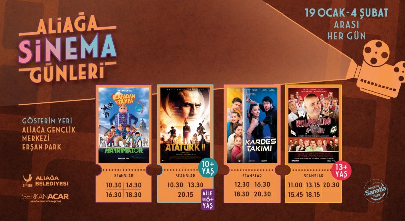 Aliağa Gençlik Merkezi Sinema Salonu’nda 19 Ocak 2024 Cuma günü başlayacak sinema şöleni 4 Şubat 2024 Pazar günü sona erecek. Öğrenciler sinema keyfini Aliağa Gençlik Merkezi Erşan Park’ta her gün 10.30 – 20.30 saatleri arasında ücretsiz olarak gösterime sunulacak; Rafadan Tayfa “Hayrimator”, Atatürk 2, Kardeş Takımı ve Kolpaçino 4 4’lük isimli filmlerle yaşayacak. Aliağa Belediyesi sinema günleri boyunca 22-23-24 ve 25 Ocak tarihlerinde çevre mahallelerde ikamet eden çocuklar için Aliağa Gençlik Merkezi’ne ücretsiz ulaşım hizmeti verecek.