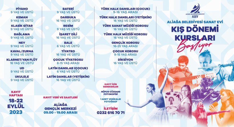 Aliağa Belediyesi tarafından Örnekkent mevkiinde projelendirilen ve yaklaşık 8 ay gibi kısa bir süre içerisinde yapımı tamamlanan Aliağa Spor ve Yaşam Merkezi (AYM), kapılarını ASEV kursları ile açıyor. Aliağa Gençlik Merkezi (AGM) ile aynı dönemde verilecek olan kış dönemi kursları için kayıtlar 18 Eylül Pazartesi günü başlıyor.