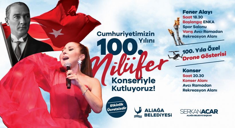 Aliağa Belediyesi tarafından hazırlanan cumhuriyetin 100. yıl kutlamalarında coşku, Türk pop müziğinin önde gelen yorumcularından Nilüfer konseriyle zirveye ulaşacak. Avcı Ramadan Çocuk Oyun ve Rekreasyon Alanı’nda saat 20.30’da sahne alacak olan Nilüfer, hafızalara kazınan unutulmaz şarkılarını Aliağalılar için söyleyecek