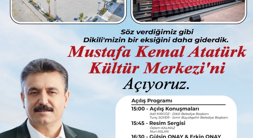 Göreve geldiği günden bu zamana kadar söz verdiği projelerden birini daha hayata geçirmenin mutluluğunu ve gururunu yaşayan Dikili Belediye Başkanı Adil Kırgöz, “Festivaller, kültürel ve sanatsal etkinliklerle bütünleşen ilçemizin en büyük eksikliği kültür merkezinin olmamasıydı. Cumhuriyetimizin 100. yılına yakışan Mustafa Kemal Atatürk Kültür Merkezi’mizi güzel Dikili’mize kazandırarak ilçemizdeki önemli bir eksikliği daha gidermiş olduk. Mutluyuz ve gururluyuz. Tüm vatandaşlarımızı 27 Eylül Çarşamba günü gerçekleştireceğimiz açılış programımıza davet ediyorum.” dedi.