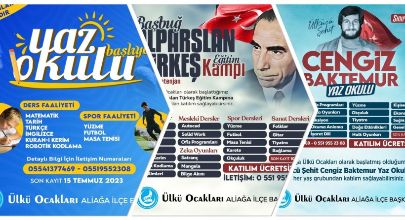 Aliağa Ülkü Ocakları eğitime verdiği önemle dikkat çekiyor. Sopa tutan eller değil, kalem tutan eller sloganıyla yola çıktıkları bu yolda, 2 senedir görevde olan Çağatay ULU geldiği günden beri Eğitim kampları düzenliyor. Ruhi Kılıçkıran Yaz Okulu, Başbuğ Alparslan Türkeş Eğitim Kampı, Cengiz Baktemur Yaz Okulu isimleriyle hem yazın hem kışın aralıksız derslere devam eden Ülkü Ocakları, sanattan spora, temel derslerden mesleki derslere bir çok ders ve faaliyetlerle ücretsiz bir şekilde dersleri gerçekleştirerek gençlere sahip çıkıyor.