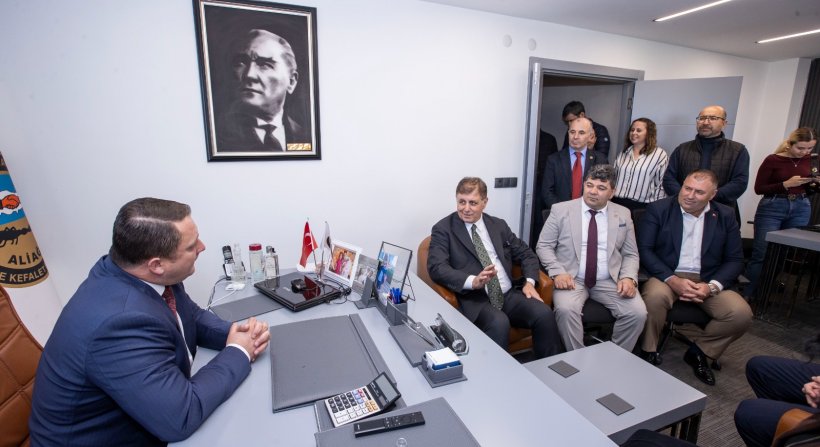 İzmir Büyükşehir Belediye Başkanı Dr. Cemil Tugay, Aliağa programı kapsamında Esnaf ve Sanatkarlar Kredi ve Kefalet Kooperatifi ile İMEAK Deniz Ticaret Odası Aliağa Şubesi'ni ziyaret etti.