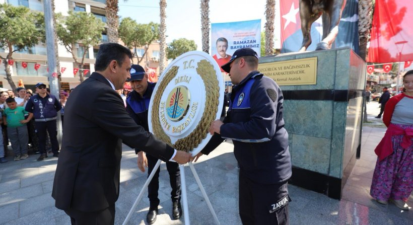 Mazbata sonrası coşkulu kalabalık eşliğinde Dikili Atatürk Meydanı’na giden Dikili Belediye Başkanı Adil Kırgöz, Atatürk Anıtı’na çelenk sundu.